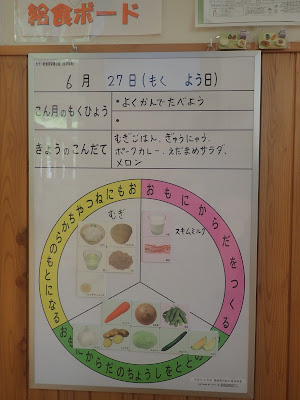 今日の献立は、『麦ごはん、牛乳、ポークカレー、えだまめサラダ、メロン』です。今日のデザートは旬のくだもの、メロンです。八百屋さんに食べ頃のおいしいメロンを届けてもらい、みんなでおいしくいただきました。
