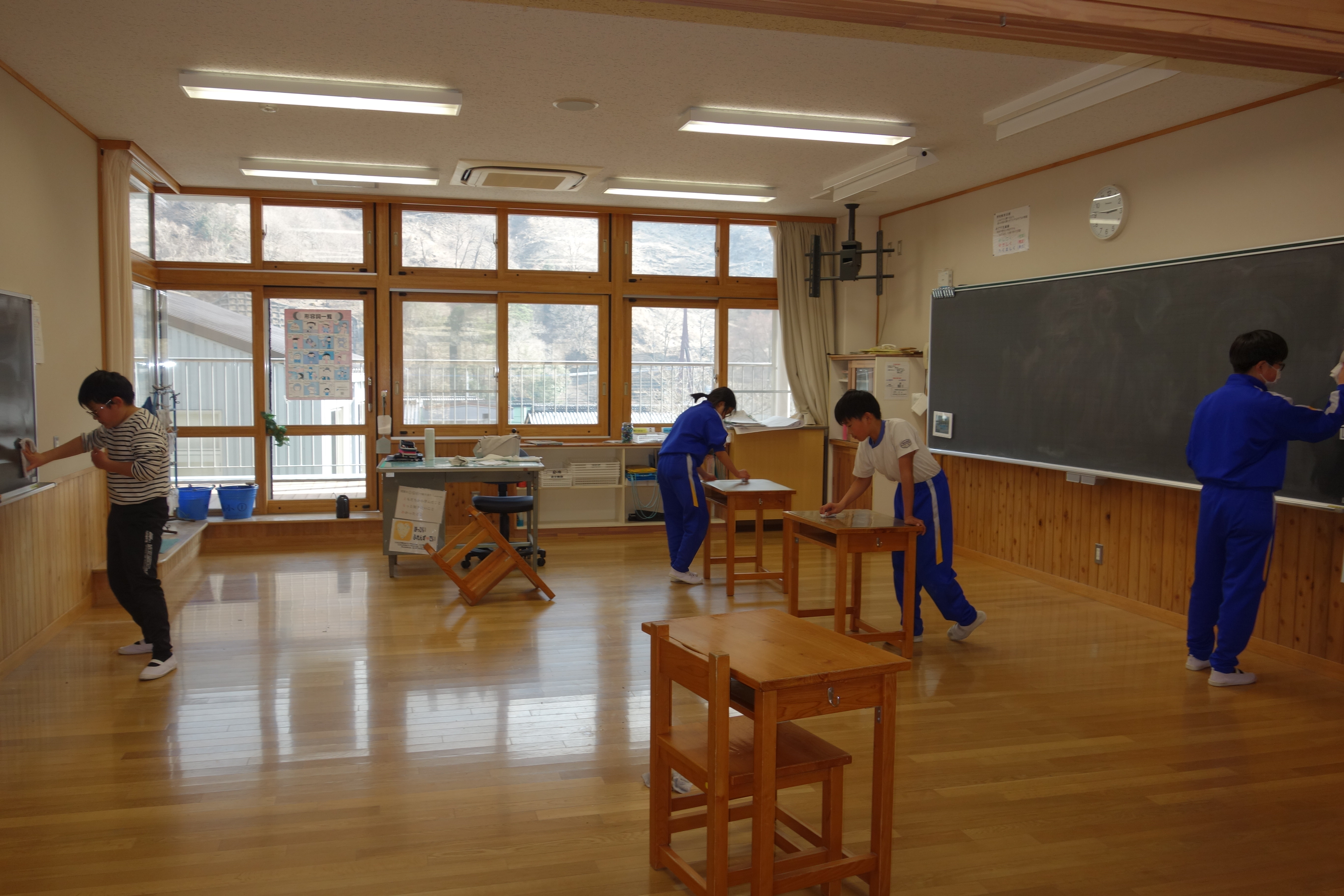 6年生のいなくなった学校は、やはり寂しいです。今日は、1~5年生が合同外国語授業を行いました。進化じゃんけんを英語で行い、みんなとても楽しそうです。クラスでは大掃除を行い、一年間、お世話になった教室をピカピカにしていました。